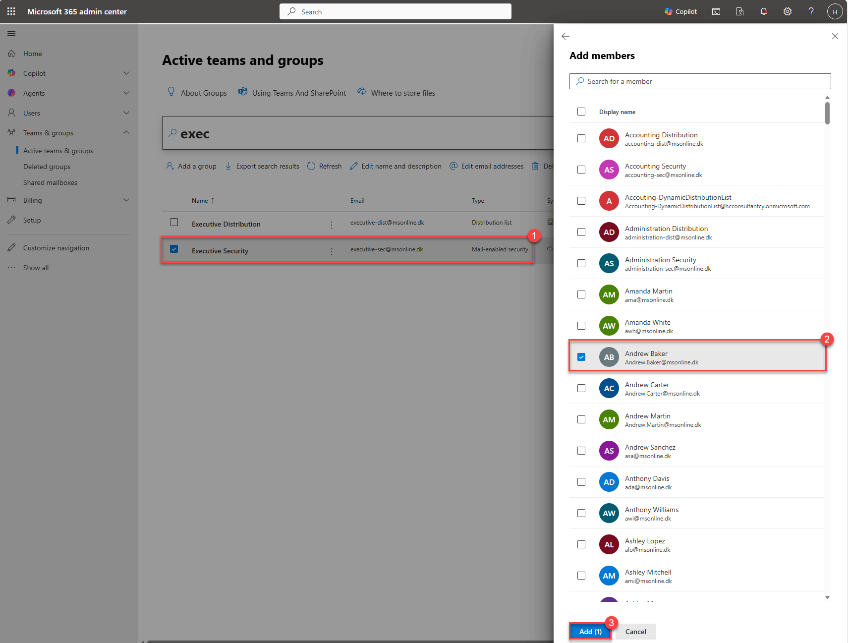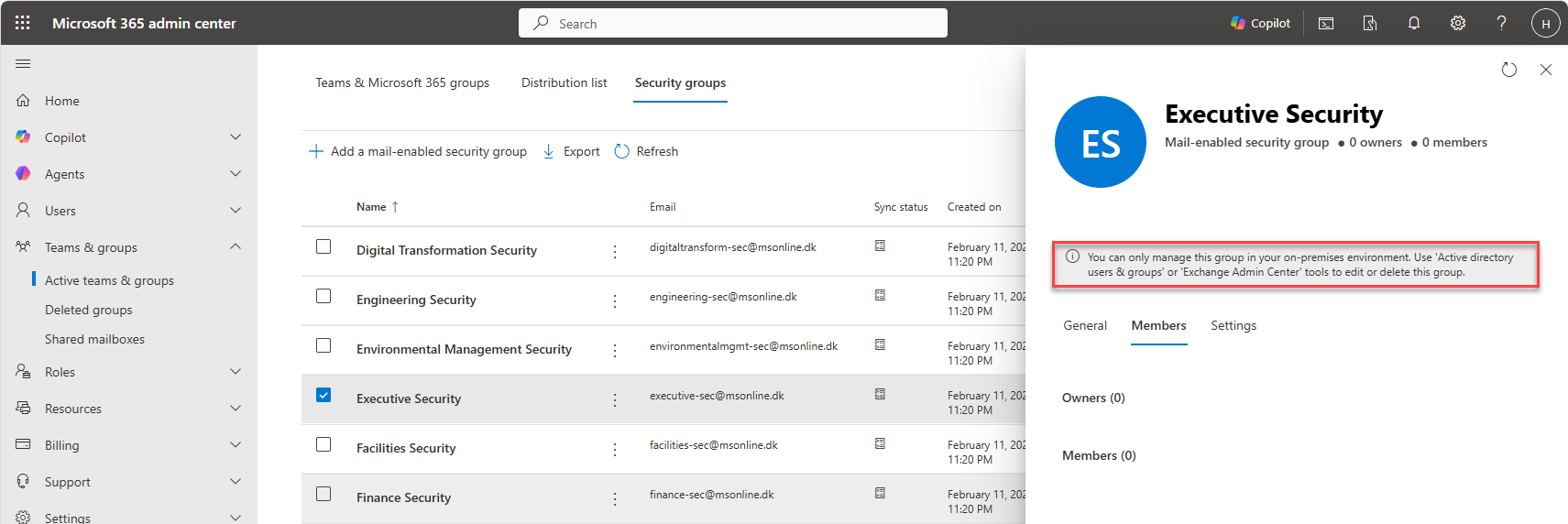 Go to the Microsoft Entra Admin Center and navigate to Groups > All groups. Find a synced distribution group or mail-enabled security group. Here you can see that you’re not able add members directly in the Entra Admin Center.