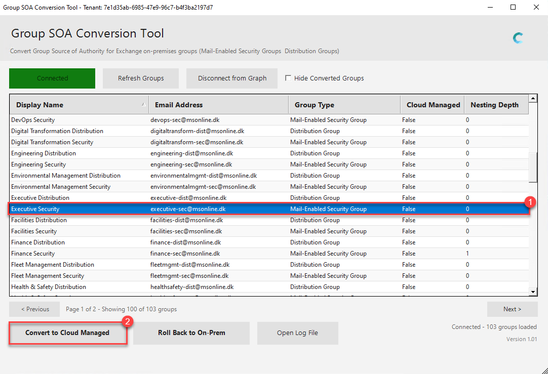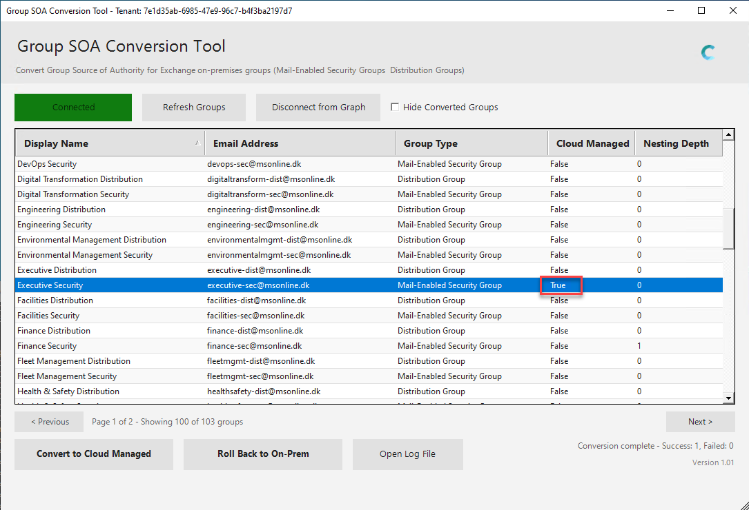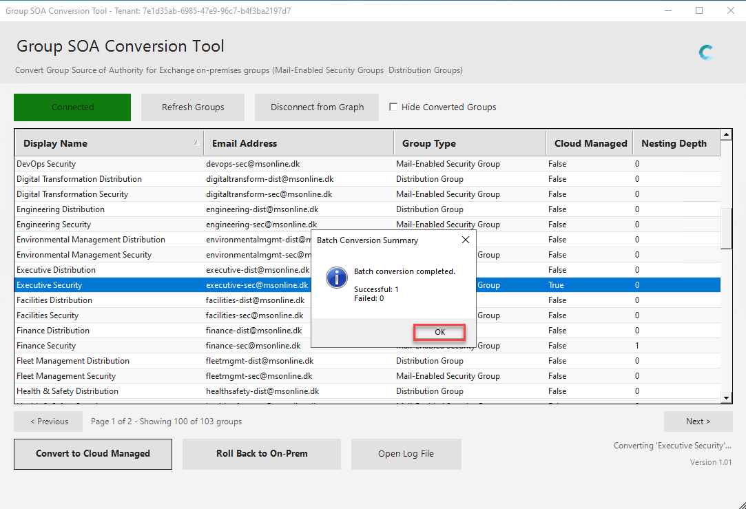 A note on nested groups: The tool automatically detects nested group relationships and computes nesting depth. When converting multiple groups, it sorts them bottom-up (deepest nested first) following Microsoft’s recommended approach. For this walkthrough, we kept it simple with a single group, but the tool handles nested scenarios automatically.