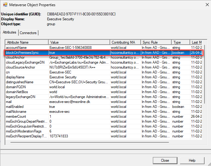 After converting a group to cloud-managed, the blockOnPremisesSync property is set to true on the Entra ID object. This means on-premises changes to the group are no longer synced to the cloud.